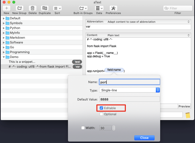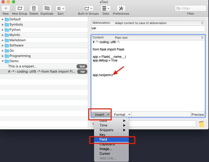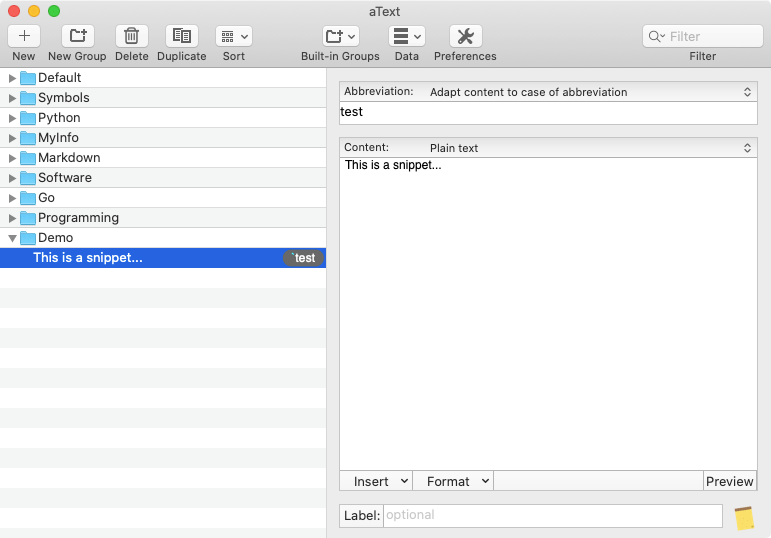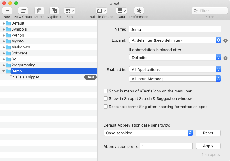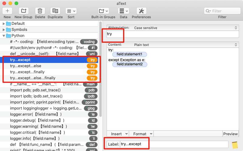 另外,如果是购买了 Alfred Powerpack 的用户,可以看看 Alfred 的 Snippets 功能,基本可以达到 aText 功能的 80%。