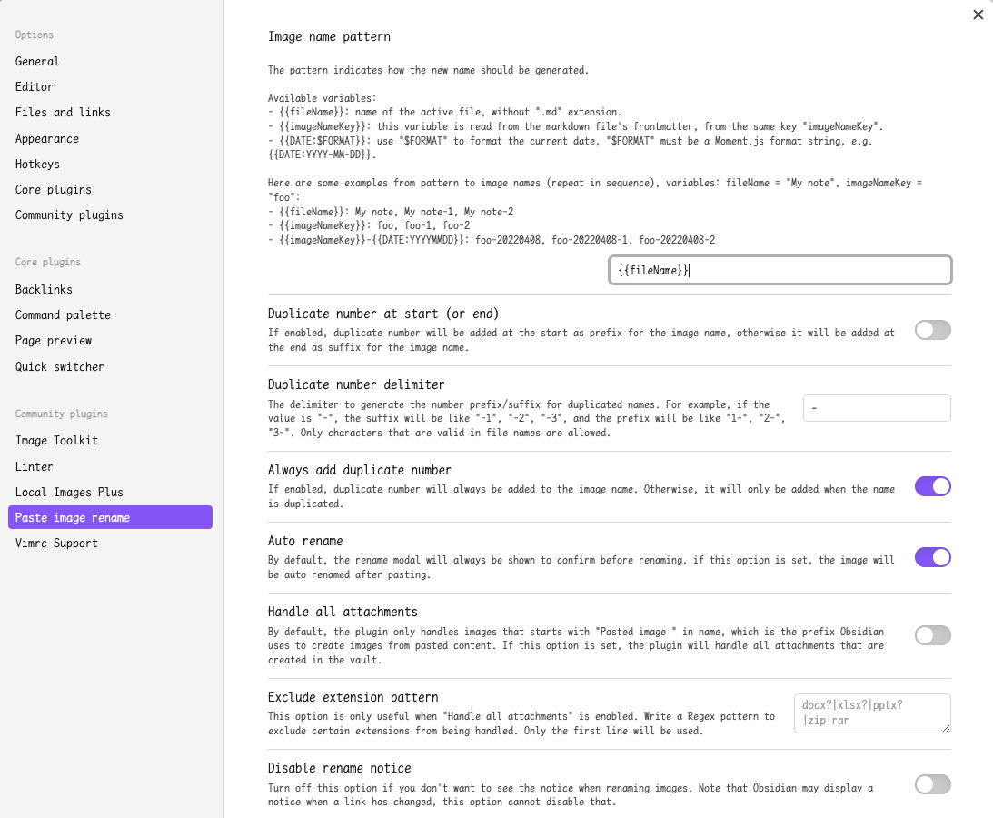 这个插件可以在粘贴图片时, 自动命名为 {{fileName}}-{{自增后缀}} 形式, 省去手动命名的烦恼.