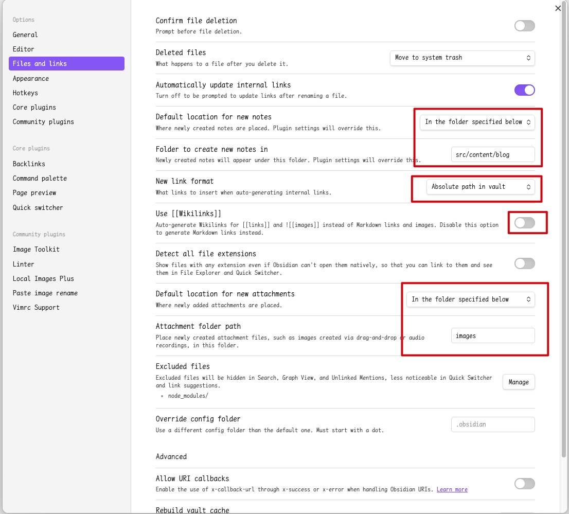 images: 存储图片及附件,Obsidian内需要配置成此目录.public/images: 软连接到images目录, 供Astro导出使用.src/content/blog: 存放博客的Markdown文件 (如果想通过软链接把文章放到项目根目录, 需要修改Astro的解析规则, 让其跟随符号链接)